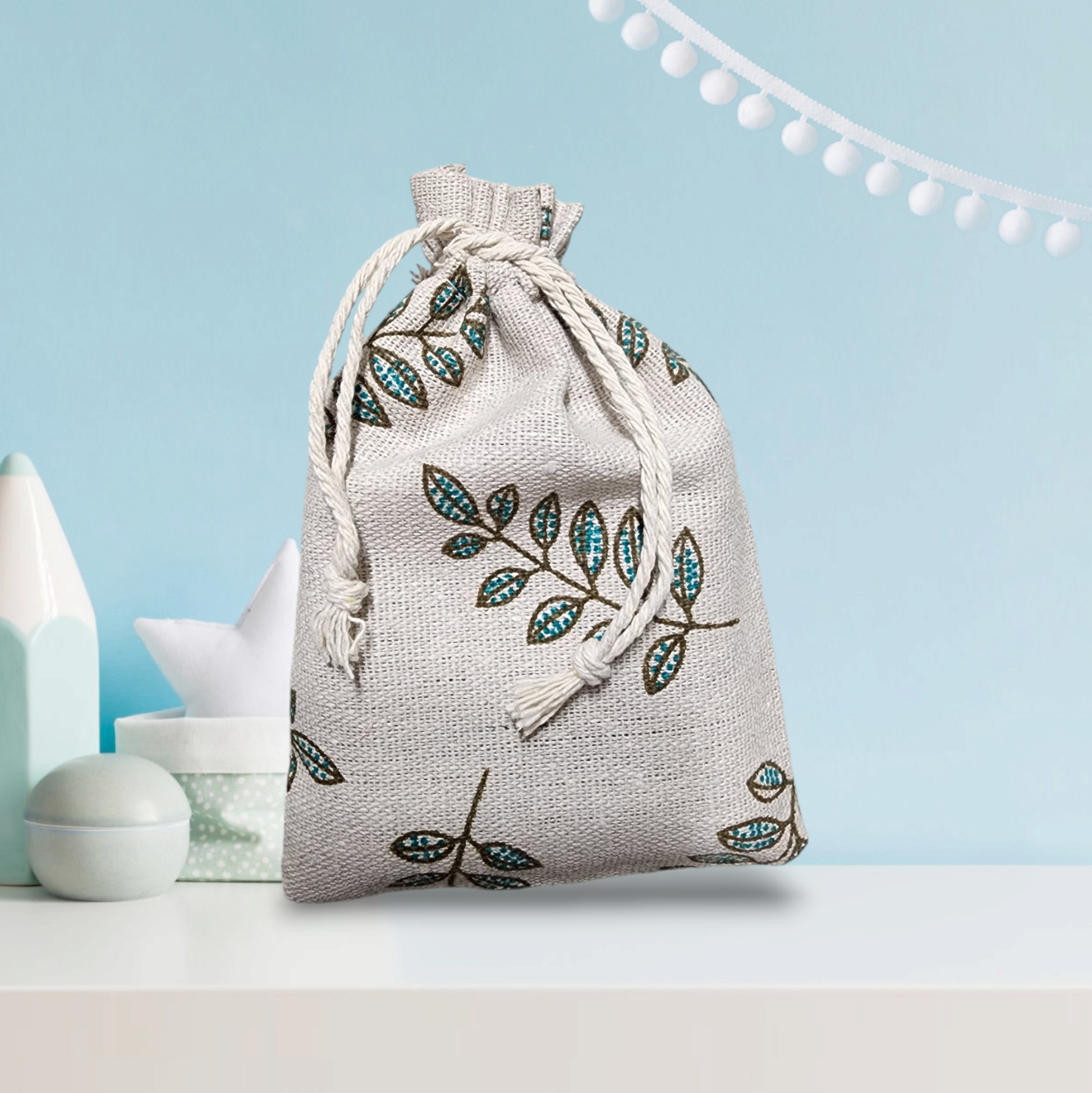 Complementa regalar tu jabones o difusor de palitos, con una bolsa de saco decorada con estampado hojas.